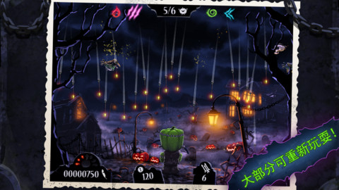 玩法:简单的操作性是最近越来越多优秀休闲类游戏的追求,本作中玩家只要用一根手指就能操纵全程,点住地上的南瓜头,往要射出弓箭的反方向拖,就能看见弓箭的指向,同样拖动距离越长,弓箭射出去的力道 就越大。游戏就是让南瓜哥哥不断射中夜空中飞来飞去的僵尸鸟,坚持得越久越好。