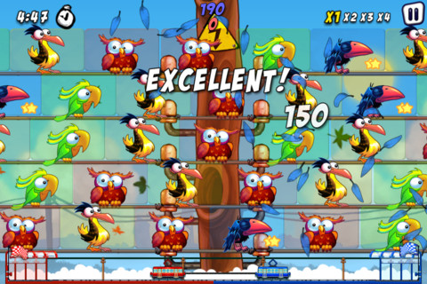简单易懂的三消游戏。滑动你的手指,在键盘上连续划过三只以上同色傻鸟即可电死(消除)它们。它们不会停在一个地方等你,而是以每条线不同的速度向右移动的(越下的电线移动越快)。不过要注意的是,有一些特殊的傻鸟会出现,要小心的是比如冰冻的,拿炸弹的等等。