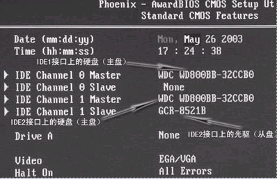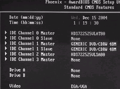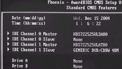 ??按“F10”键保存BIOS设置,重新启动电脑后,再次进入BIOS的“Standard CMOS Features”窗口就会发现,SATA硬盘占据了“IDE Channel 0 Master”通道,而PATA硬盘则占据了“IDE Channel 1 Master”通道,光驱占据“IDE Channel 1 Slave”通道。