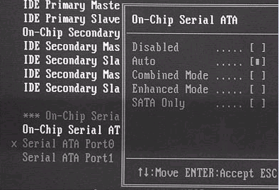 ??再将光标移动到窗口下方的“On-Chip Serial ATA”选项上按回车键,然后在弹出的窗口中选中“Combined Mode”后按回车键。