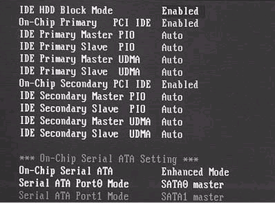 ??设备安装好以后也要到BIOS中进行设置,具体设置方法和前面“1个PATA硬盘+1个SATA硬盘+1个光驱”的设置方法大同小异。不同的地方是“On-Chip Serial ATA”选项和“Serial ATA Port0 Mode”选项的设置,其中前者应设置为“Enhanced Mode”,后者须设置为“SATA0 Master” 。
